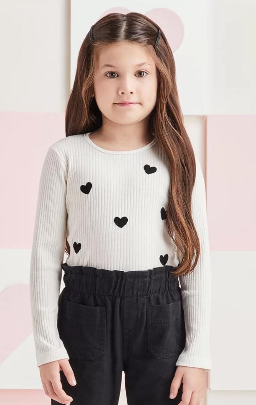 A Blusa Momi off white é confeccionada em malha canelada, proporcionando conforto e estilo. Destaca-se pela encantadora estampa de corações na parte da frente, essa peça se torna uma escolha perfeita para compor o guarda-roupa das meninas. Composição: 49% poliéster, 49% algodão e 2% elastano. Ref.: H4895