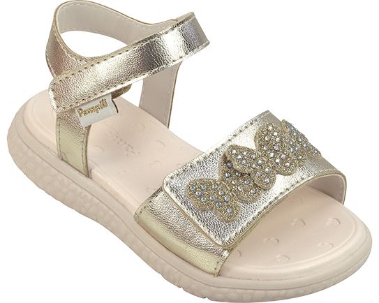 Sandália infantil feminina monocromática dourada com borboletas bordadas em alto relevo na tira superior e pedrinhas brilhantes, encantadora e confortável para todos os momentos.