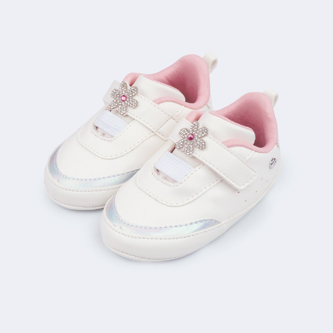 Tênis de bebê feminino em sintético branco com aplicação de enfeite de flor com pedrinhas brilhantes delicadas, versátil para todos os momentos! Tênis com forro em tecido que auxilia na absorção do suor e espuma para acolher e cuidar dos pezinhos sem interferir no desenvolvimento natural. Tênis infantil com calce fácil e fechamento através de elástico e fita aderente, facilitando o dia a dia da mamãe!