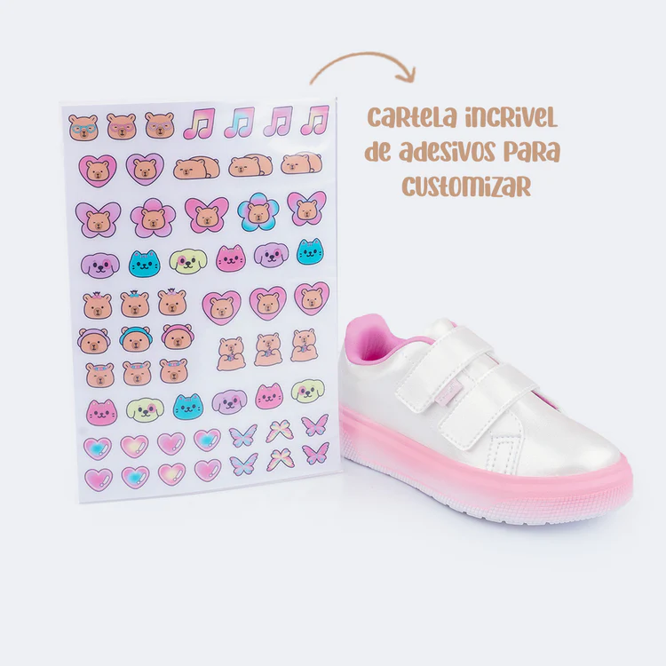 O grande diferencial é a cartela incrível de adesivos que acompanha o tênis, permitindo que as meninas personalizem tanto o calçado quanto suas bolsas do jeito que quiserem! Uma proposta criativa para estimular a imaginação e garantir looks únicos.
