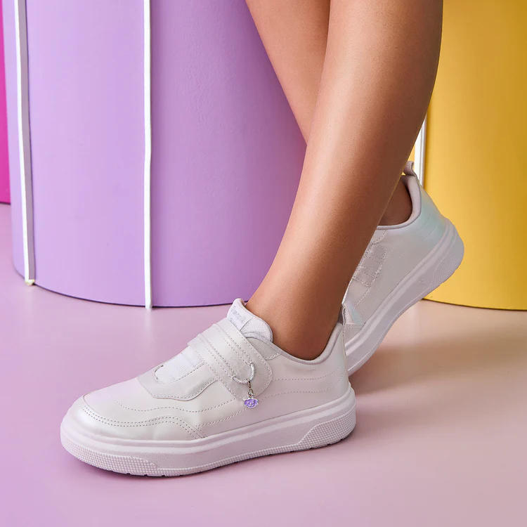 O tênis casual perfeito para meninas que amam personalizar o visual! Este modelo chega com acabamento perolado branco com detalhes levemente prateados, trazendo um toque delicado e moderno ao look. E detalhe, o tênis acompanha dois pingentes de metal esmaltado, permitindo que as meninas deixem o calçado com a sua cara, personalizando com quiserem.