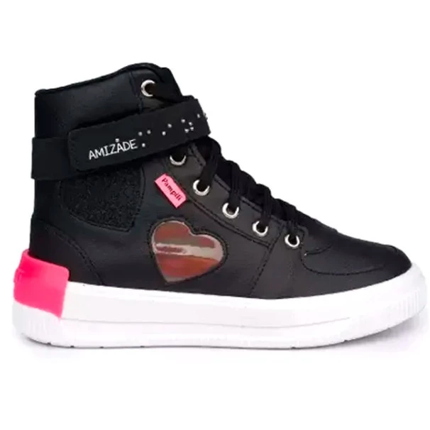 Tênis cano Alto infantil em sintético, com corações na lateral em glitter e transparência, casual e moderno para o dia a dia! Tira com aplicação hotfix de tachas formando a palavra amizade em braile. Tênis com forro interno em tecido que auxilia na absorção do suor e espuma comfy no calcanhar. Palmilha Feet Care que possui um sistema avançado de fofura, com a densidade ideal para os pés, minimizando impactos. Fechamento através de cadarço , permitindo ajuste no pé.